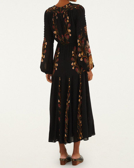 Farm Rio Black Berry Garden Long Sleeve Pleated Maxi Dress