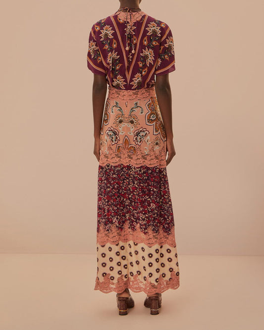 Farm Rio Glam Tapestry Burgundy Laces Short Sleeve Maxi Dress