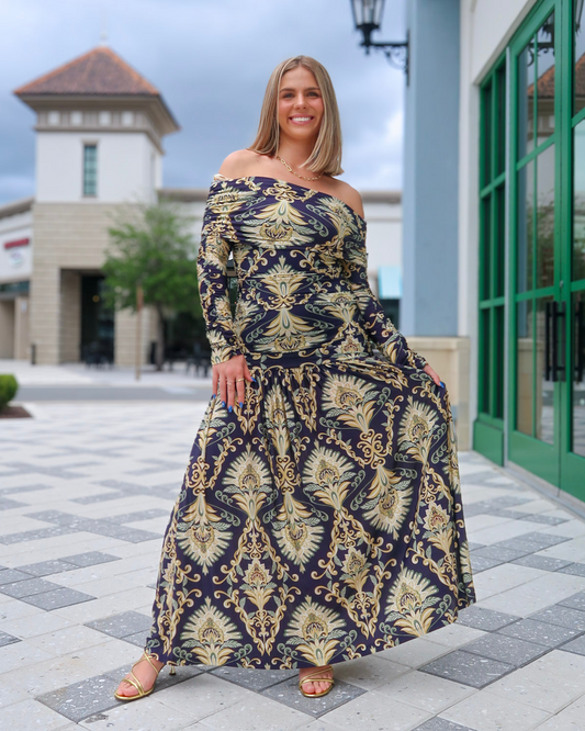 Farm Rio Navy Blue Wonderful Arabesque Off-Shoulder Maxi Dress