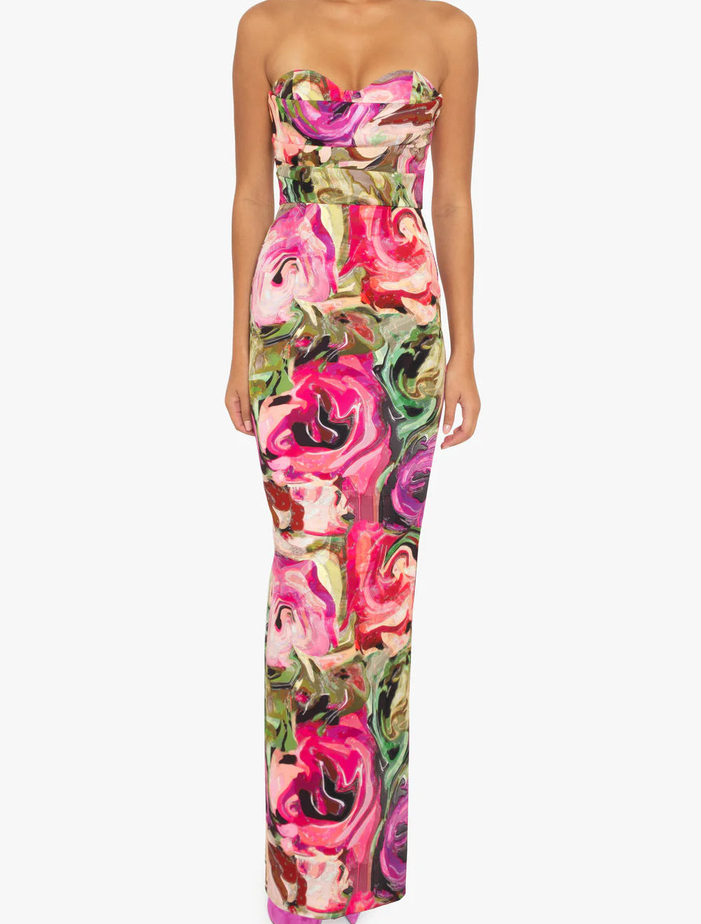 A striking strapless column gown featuring an floral print that makes a bold statement. The structured bodice is designed with a cup detail and a draped overlay, creating a flattering silhouette.