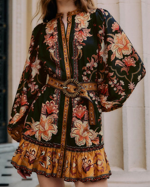 Farm Rio Black Majestic Garden Beaded Buckle Long Sleeve Mini Dress