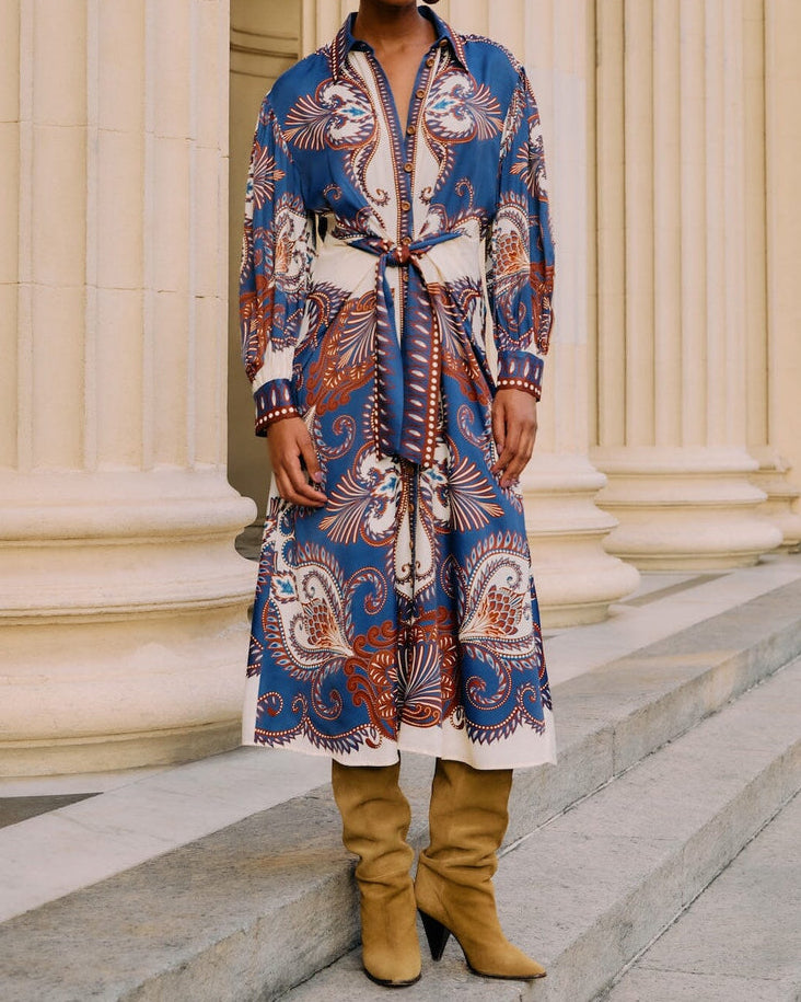 Wrapped in vibrant blue arabesque patterns, this midi dress from FARM Rio flows effortlessly with its soft Lenzing™ Ecovero™ viscose fabric. The collar neckline adds a touch of classic charm, while the playful silhouette dances with every step. Lightweight and breathable, this dress blends responsible craftsmanship with joyful elegance, inviting warmth and ease into your wardrobe with a distinct Brazilian flair.