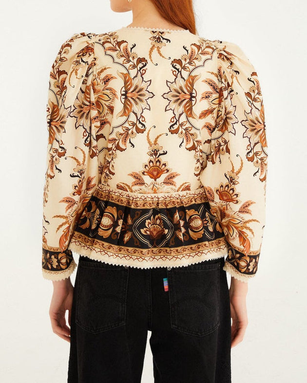 Farm Rio Sand Majestic Garden Lace Puff Sleeve Organic Cotton Blouse