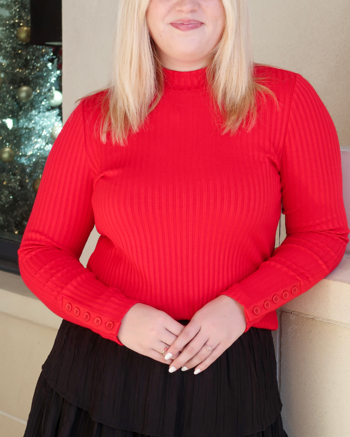 An everyday go-to, made better. This rib-knit mock neck top delivers refined ease with long sleeves, a straight hem, and subtle button details at the cuff. Soft and easy to wear, it’s a versatile staple that moves seamlessly between seasons—and looks good in every color.