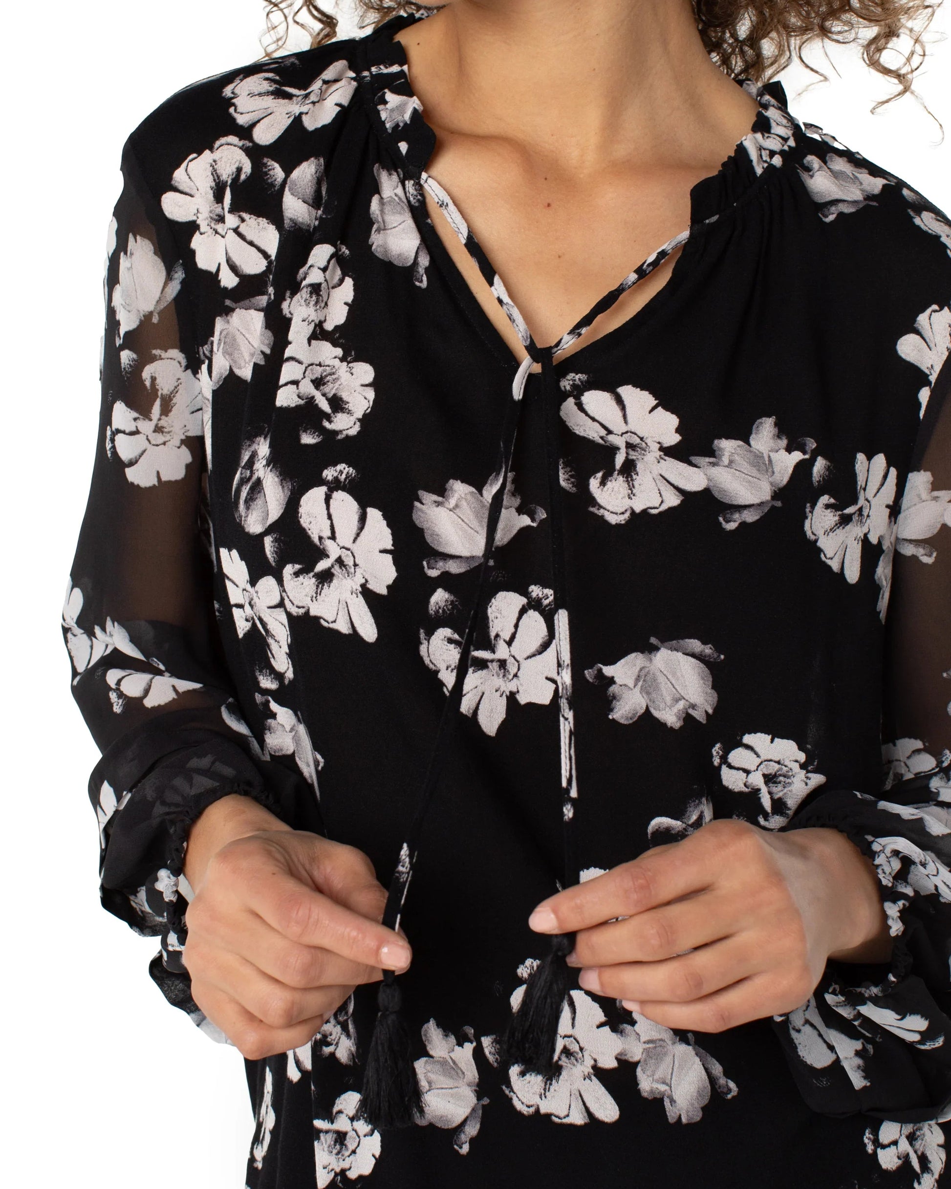 Designed in our exclusive black and white floral print, this woven blouse features a soft V-neckline with tie and tassel detail, delicate shirring, and a subtle neck ruffle. The bishop sleeves and pleated accents add graceful movement, creating a feminine silhouette that feels timeless yet modern.