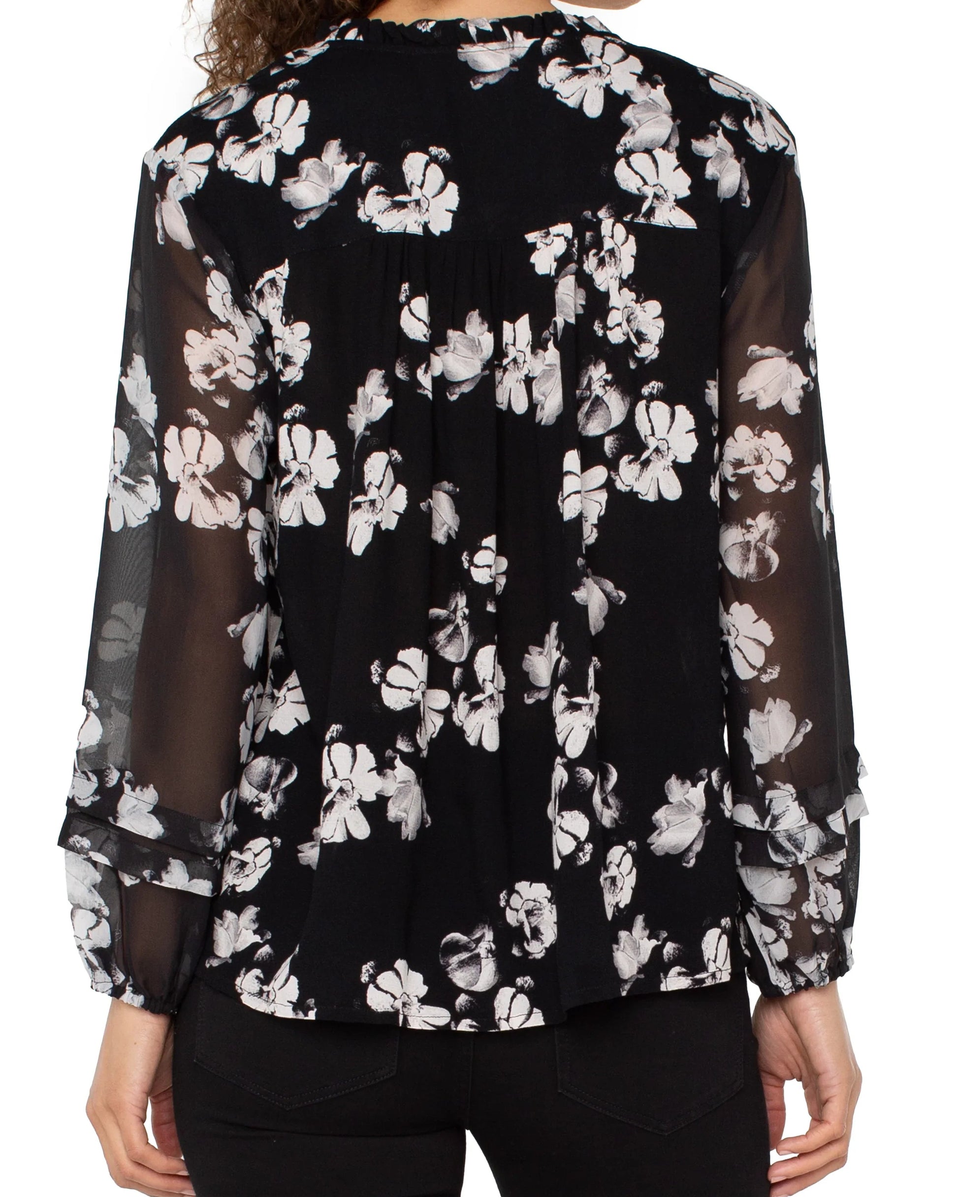Liverpool Long Sleeve Popover Shirred Woven Blouse | Black White Floral