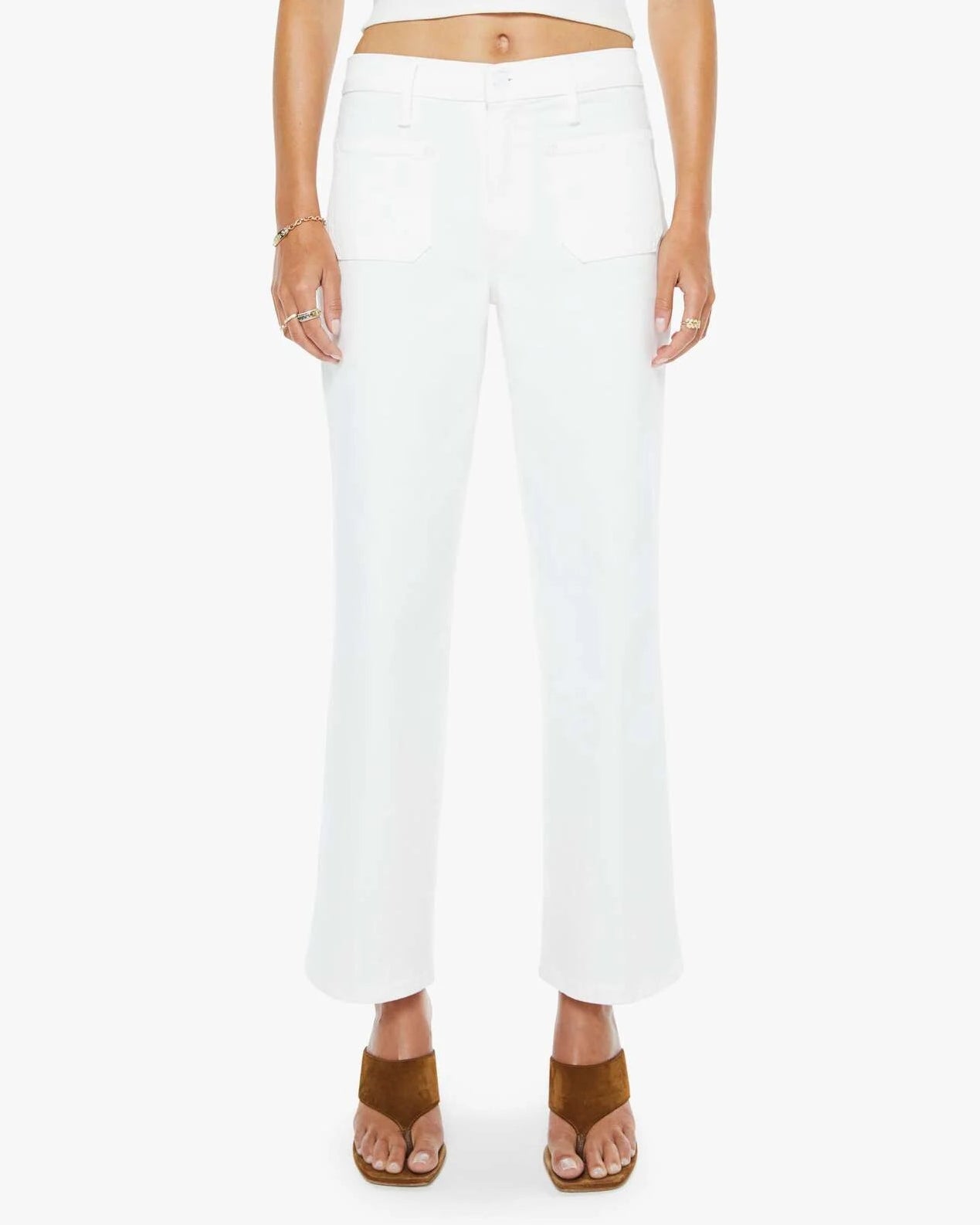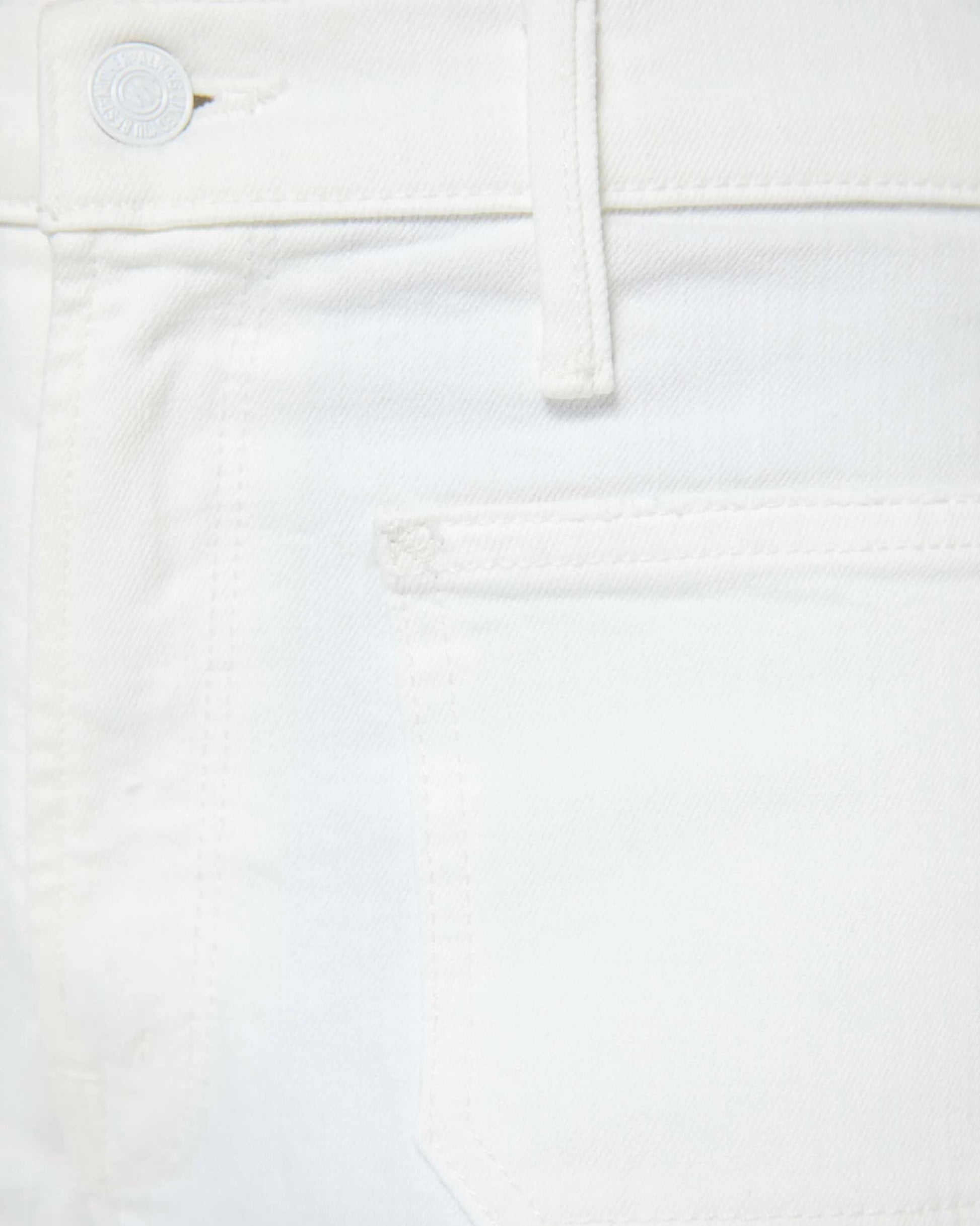 MOTHER's in the clear. Mid-rise jeans with a loose fit, zip fly, wide leg, patch pockets and ankle-length inseam with a clean hem. Cut from semi-rigid SUPERIOR denim, Totally Innocent is a classic white with tonal hardware.