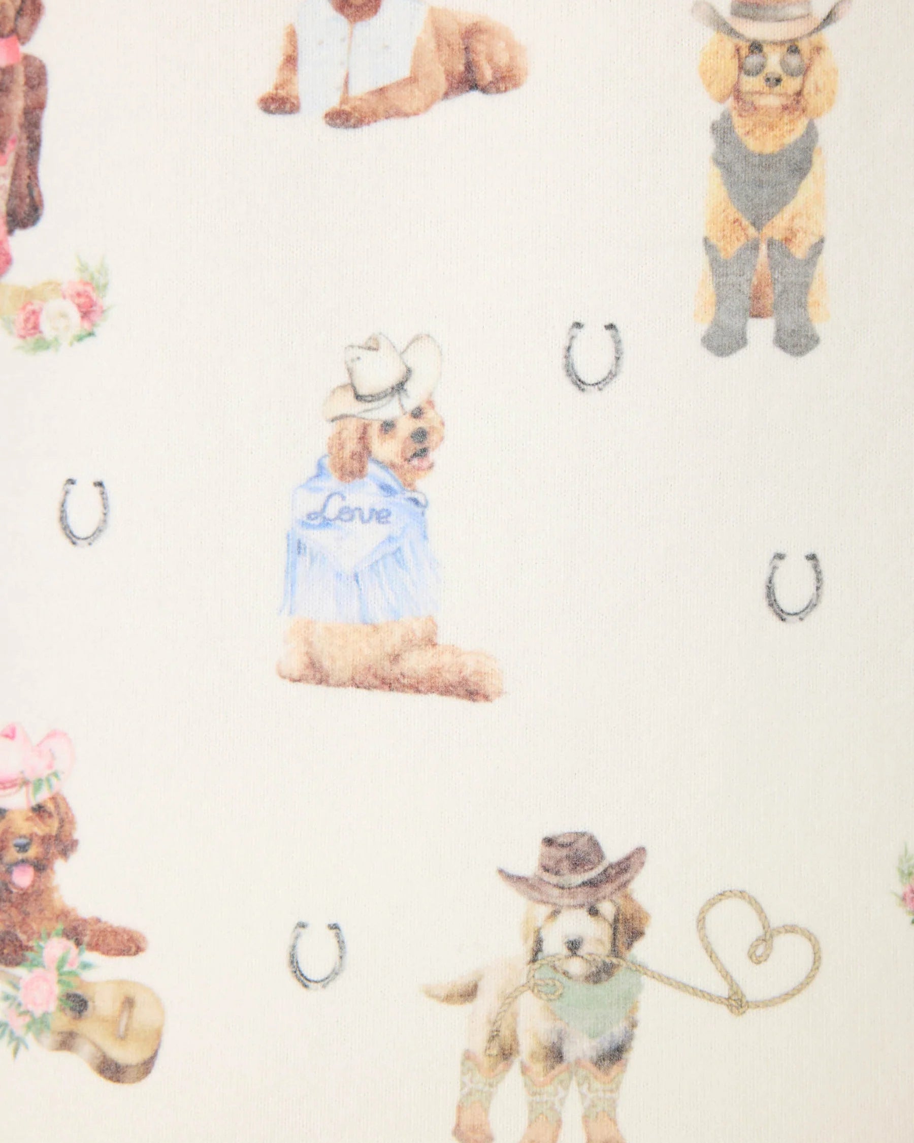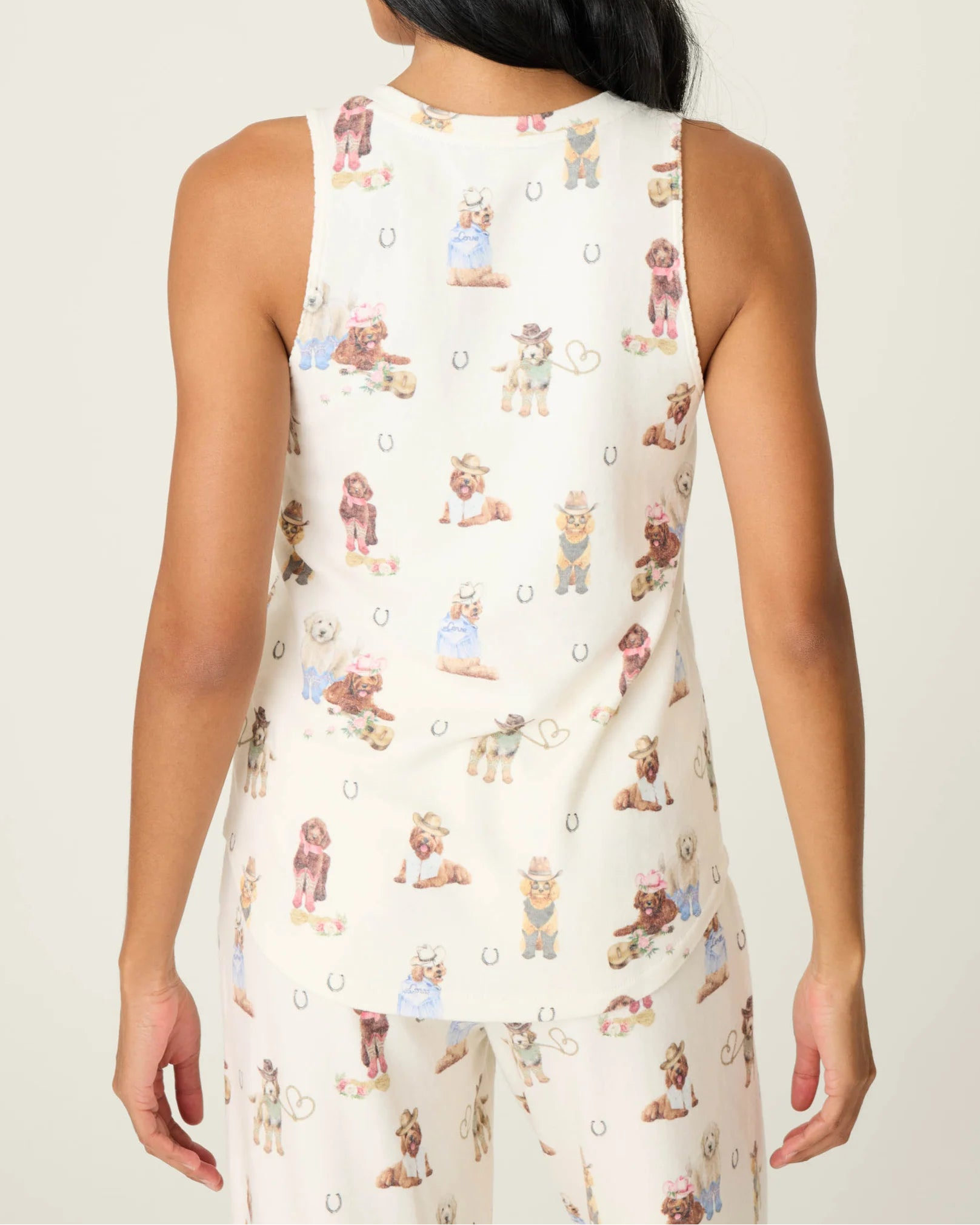 - Women’s ivory PJ tank with V-neck, curved hem, and allover western dog print featuring cowboy hats, boots, guitars, and horseshoes.
