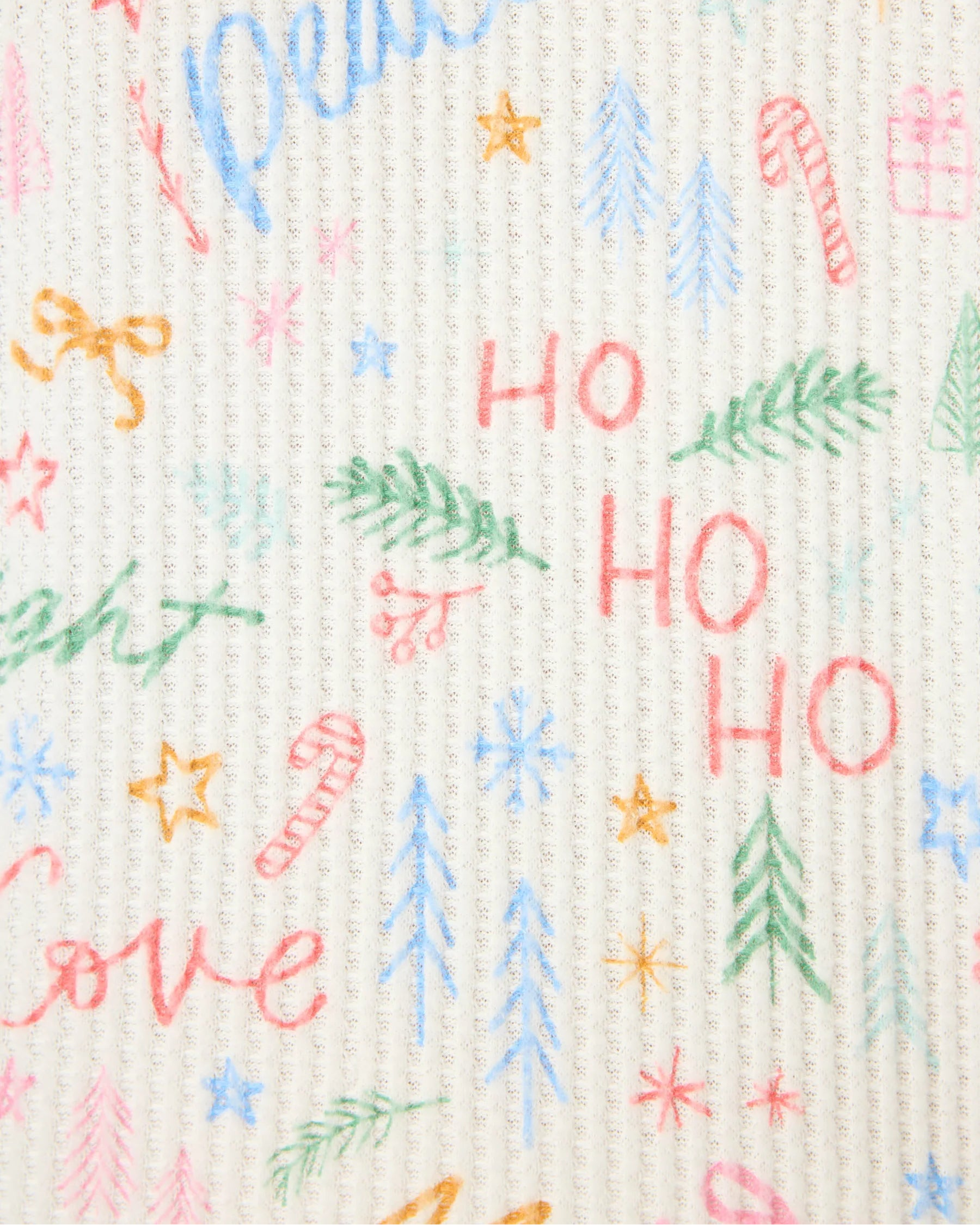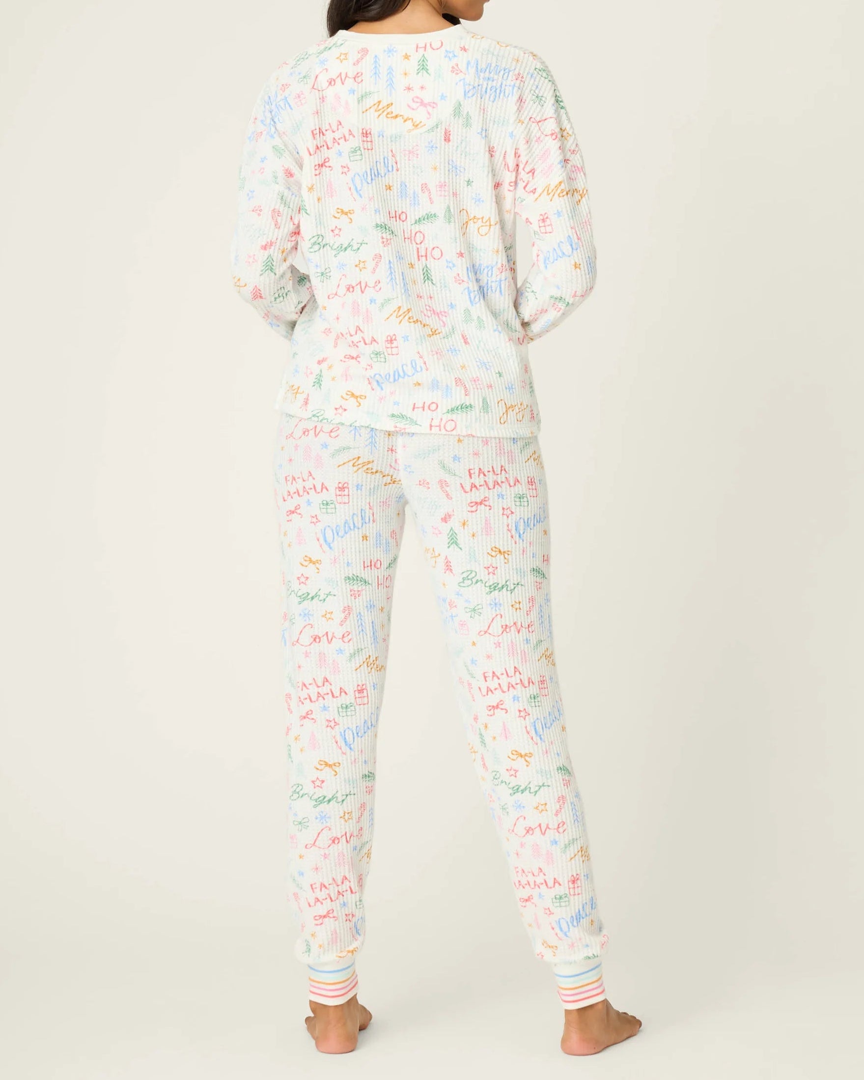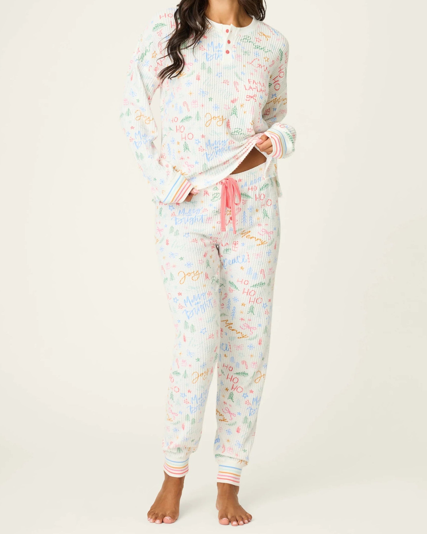 Bring the après-ski spirit home in this brushed thermal pajama set, covered in colorful holiday lettering from “Joy” to “Fa-La-La-La-La.” A henley top with red buttons pairs with jogger pants tied with a red ribbon and finished with rainbow-striped cuffs—holiday cheer, perfect for fireside lounging after a day in the snow.