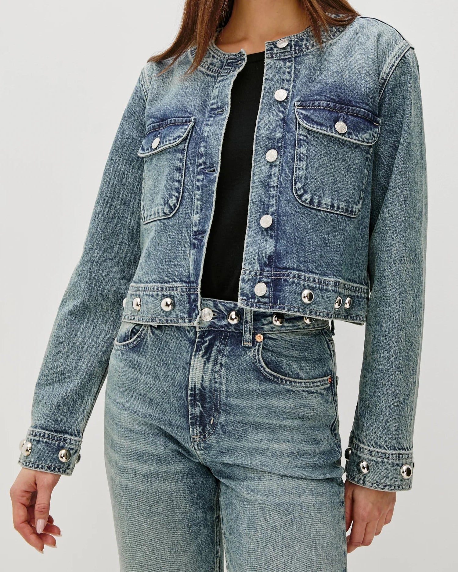 The Capistrano is a cropped, collarless 'lady' jacket with a boxy fit. Rounded studs at the hem and sleeves lend a little edge, and flap pockets finish the look. For a less cropped cut, see the Lido jacket.