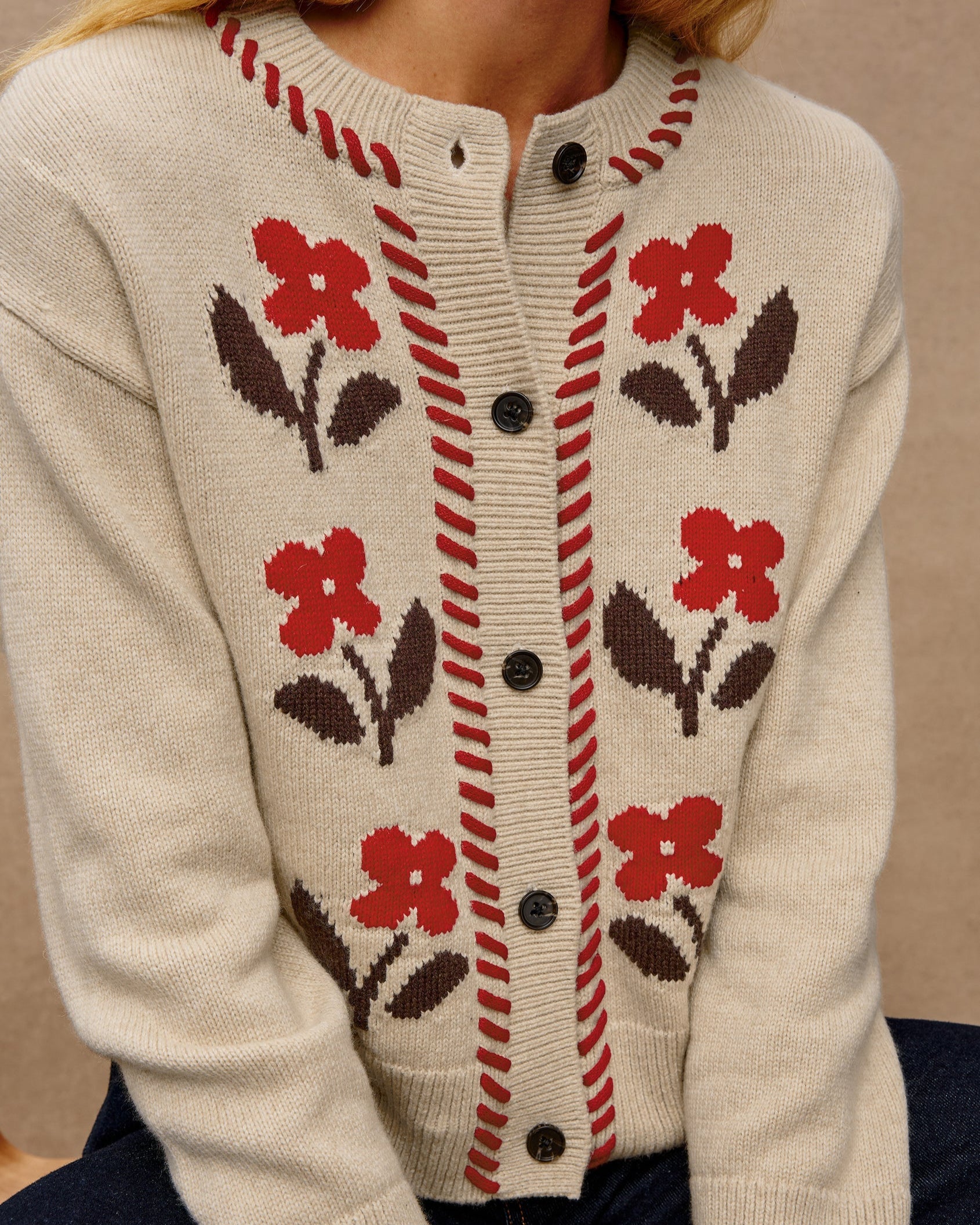 The Mavie is a heritage-inspired cardigan crafted from a cozy wool blend with a boxy-cropped fit. Blanket stitching and jacquard florals add a nostalgic touch.