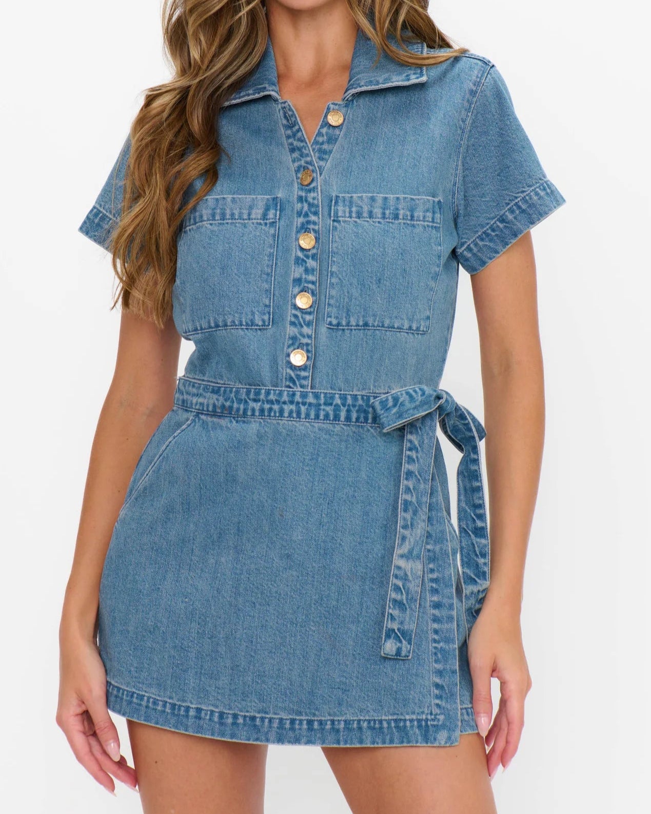 Meet the Stateside Romper, your denim go-to with a twist! This one-piece wonder features a partial button front and a built-in wrap skort for an easy, pulled-together look. It’s laid-back but polished, perfect for wherever your day takes you - just add sneakers or cowboy boots and you're out the door!