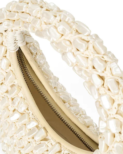 The STAUD Reef Bag is a hand held novelty bag crocheted with pearlescent beads reminiscent of sea shells. This style features a curved top handle with a zipper closure.