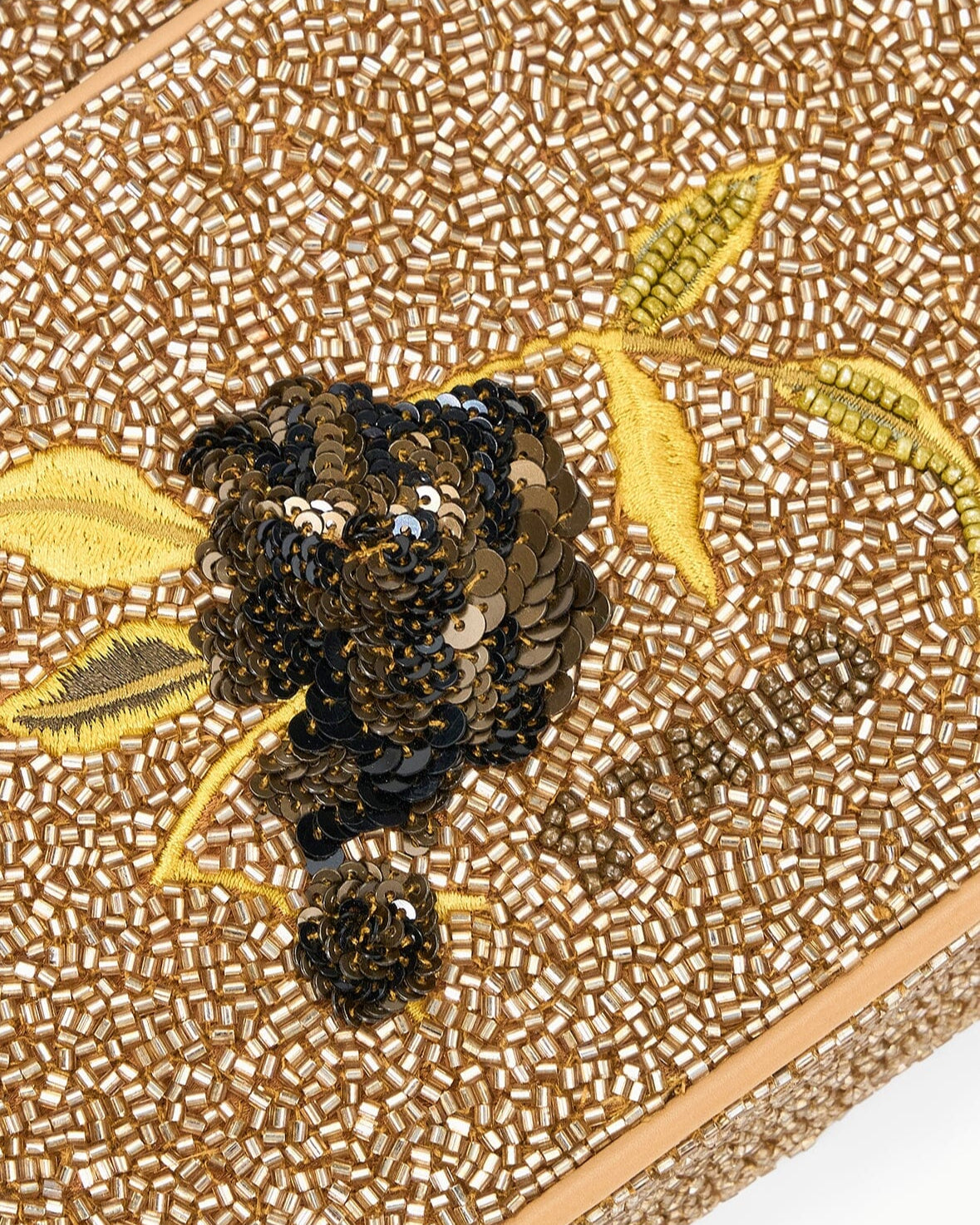 Our latest limited-edition Tommy features a seasonal vintage floral pattern. The Tommy Bag is a hand-beaded shoulder bag with vegan leather piping. This style features a single flap closure, inner zip, and a back slip pocket.
